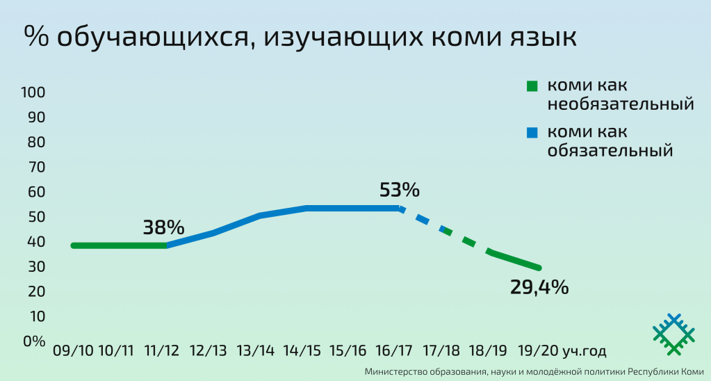 В 2011 году коми язык стал обязательным предметом во всех школах Республики. К 2016-2017 учебному году в 97% школах изучался коми язык: всего его изучало 53% школьников. Это был самый максимум. Но уже в 2018 году был принят «закон о родных языках», после которого изучение коми как обязательного было отменено. И уже к 2020 году его изучало только 29,4% школьников. Это меньше, чем до 2011 года.