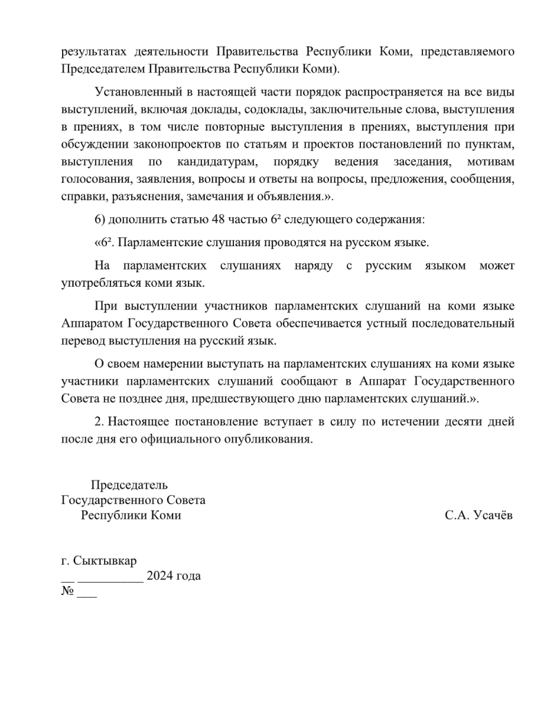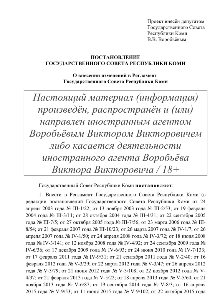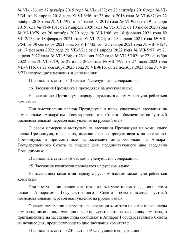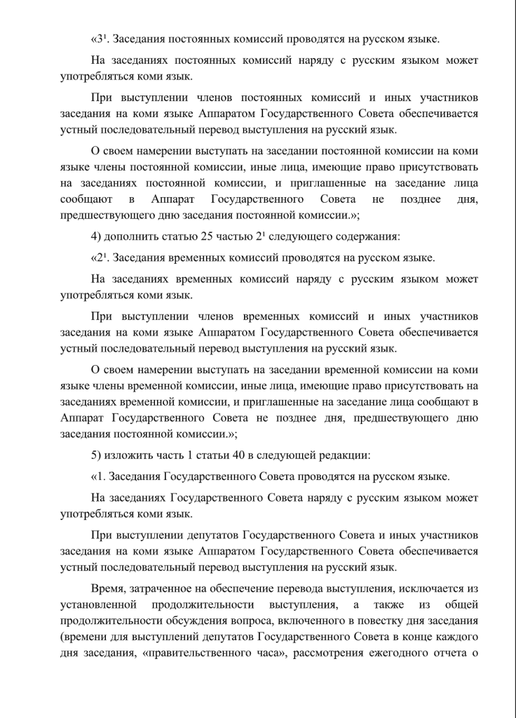 Виктор Воробьёв в своей инициативе (все документы есть в распоряжении редакции) предлагает изменения как в закон о Госсовете Коми, так и в его регламент. Если предложения депутата примут, в республиканском парламенте будет разрешено выступать на коми языке, но с обязательным переводом на русский, что не должно отнимать время выступления. Предупреждать о выступлении на коми языке предполагается как минимум за день до заседания.