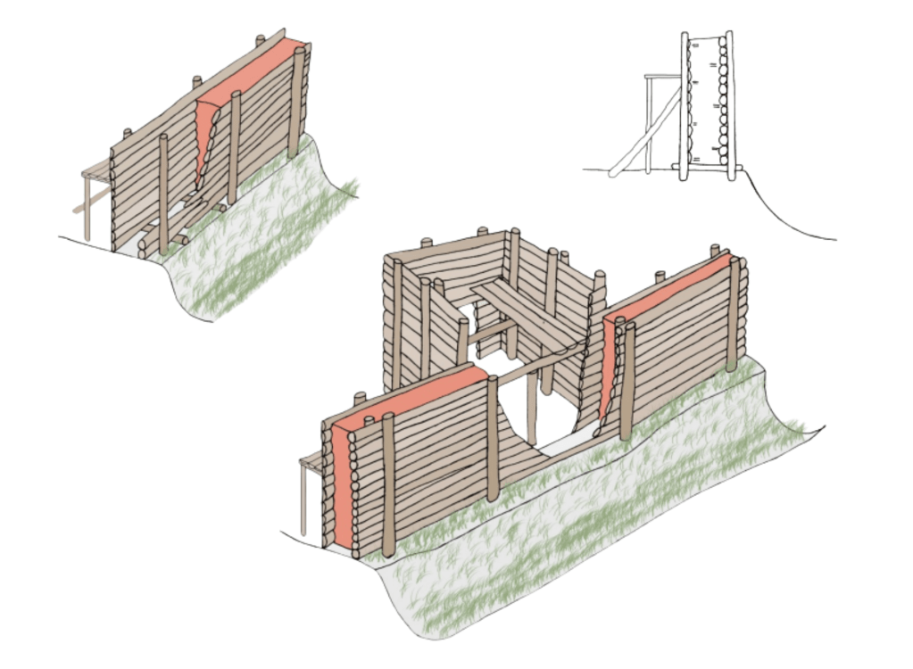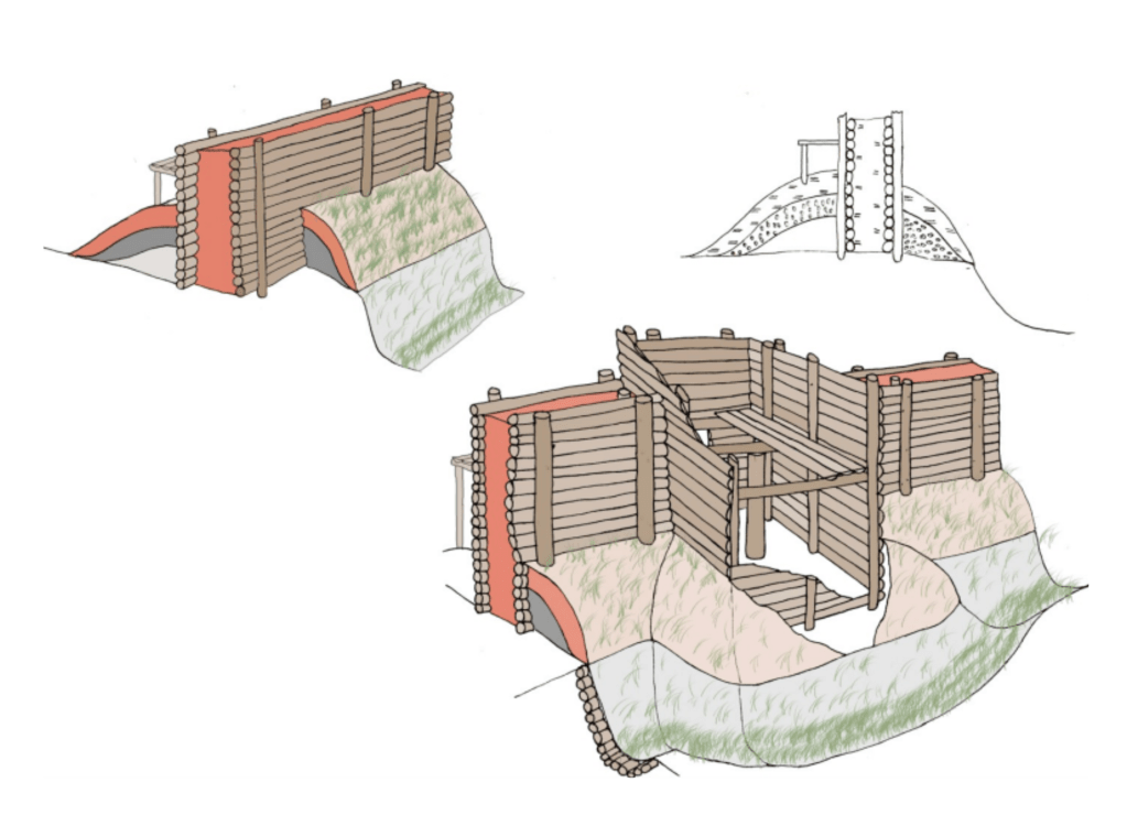 Снаружи и внутри стен был насыпан вал из глины с галькой, которые добавляли жесткость конструкции, образуя «панцирь», а внешняя поверхность вала дополнительно укреплена: обмазана красной глиной.