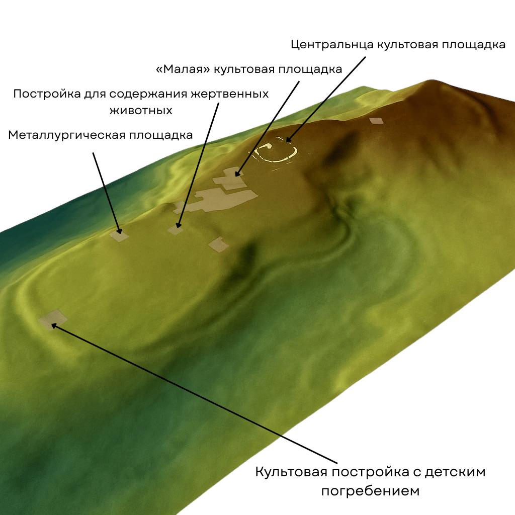 Вызывает отдельный интерес одна из таких построек, которая занимает 43 м². Внутри неё были найдены скопления костей животных и несколько лошадиных челюстей. Рядом находилось погребение ребенка и развалы ананьинских сосудов IV века до нашей эры. Это помещение может иметь несколько интерпретаций.