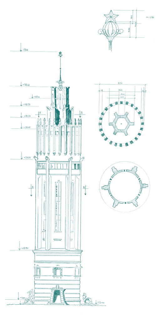 Башню высотой 54,4 метра соорудили за два года. Ещё одна легенда рассказывает, что на стройке работали ссыльные из самых разных регионов советского союза, говорящие на разных языках — потому водокачку прозвали «Вавилонской башней».