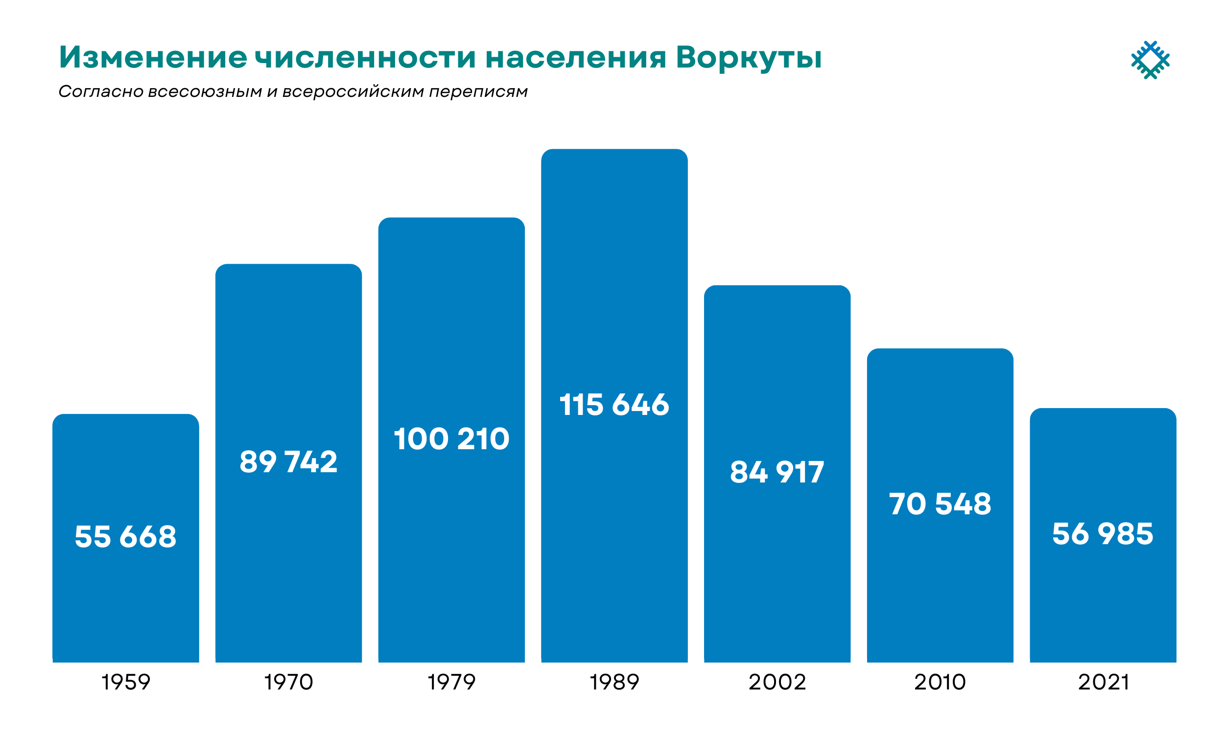 С 2017 года численность населения Республики сокращается. Многие города и посёлки Коми пустеют: население Воркуты, которая строилась на сотни тысяч жителей, сократилось до 55 тысяч человек.
