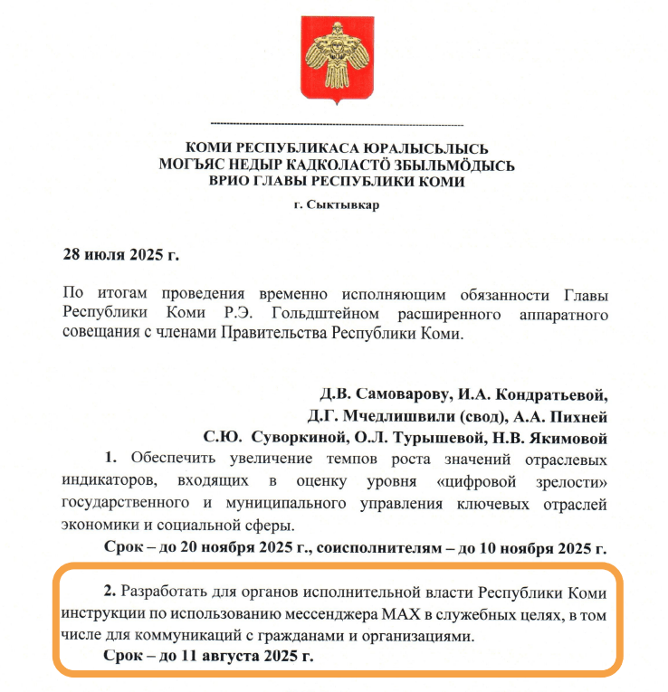 Так ещё в конце июля этого года правительство Республики Коми выпустило распоряжение, согласно которому чиновники, представляющие испольнительную власть, должны не только установить себе Max, но и коммуницировать с гражданами и организациями только через него. При этом рекомендовано установить новый мессенджер не только на служебные, но и на личные устройства. И, разумеется, чиновники обязаны популяризировать Max среди населения, а также среди предприятий малого и среднего бизнеса.