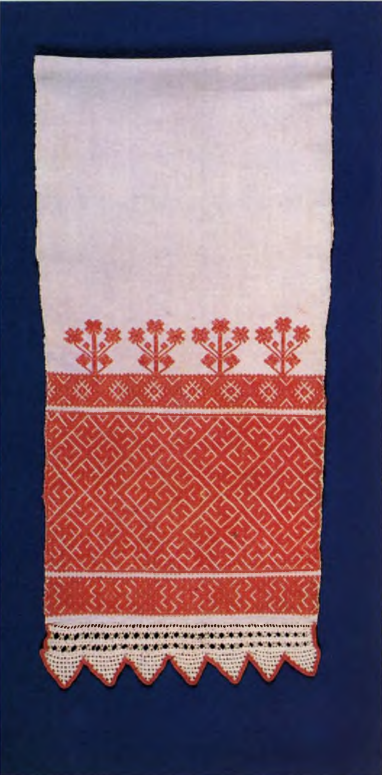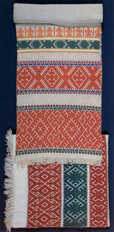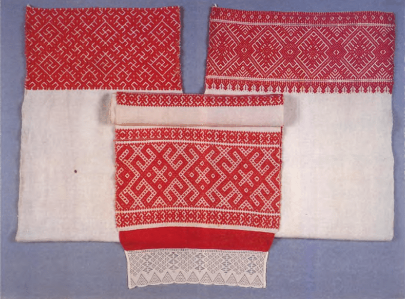 Коми на своих рушниках тоже вышивали орнаментальные ленты, и часто вписывали в орнамент рисунок. На редких рушниках можно встретить изображение женских фигур, которые выражали пожелание плодородия. Геометрический орнамент лент также символизировал процветание:ромбы, косые кресты, образы птицы.