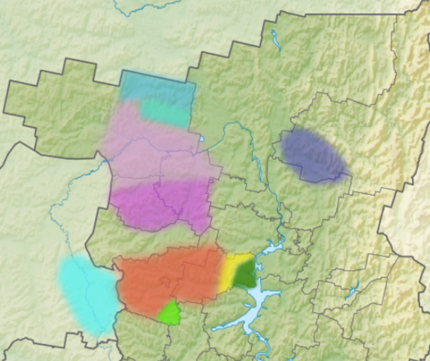 Здесь важно вернуться к коми-пермякам. Возьмём три карты: карту строгановских владений по жалованным грамотам 1558 и 1568 гг., карту гидронимов современного Пермского края и карту современного расселения коми-пермяков. На иллюстрации ниже эти территории обозначены латинскими цифрами I и II соответственно.